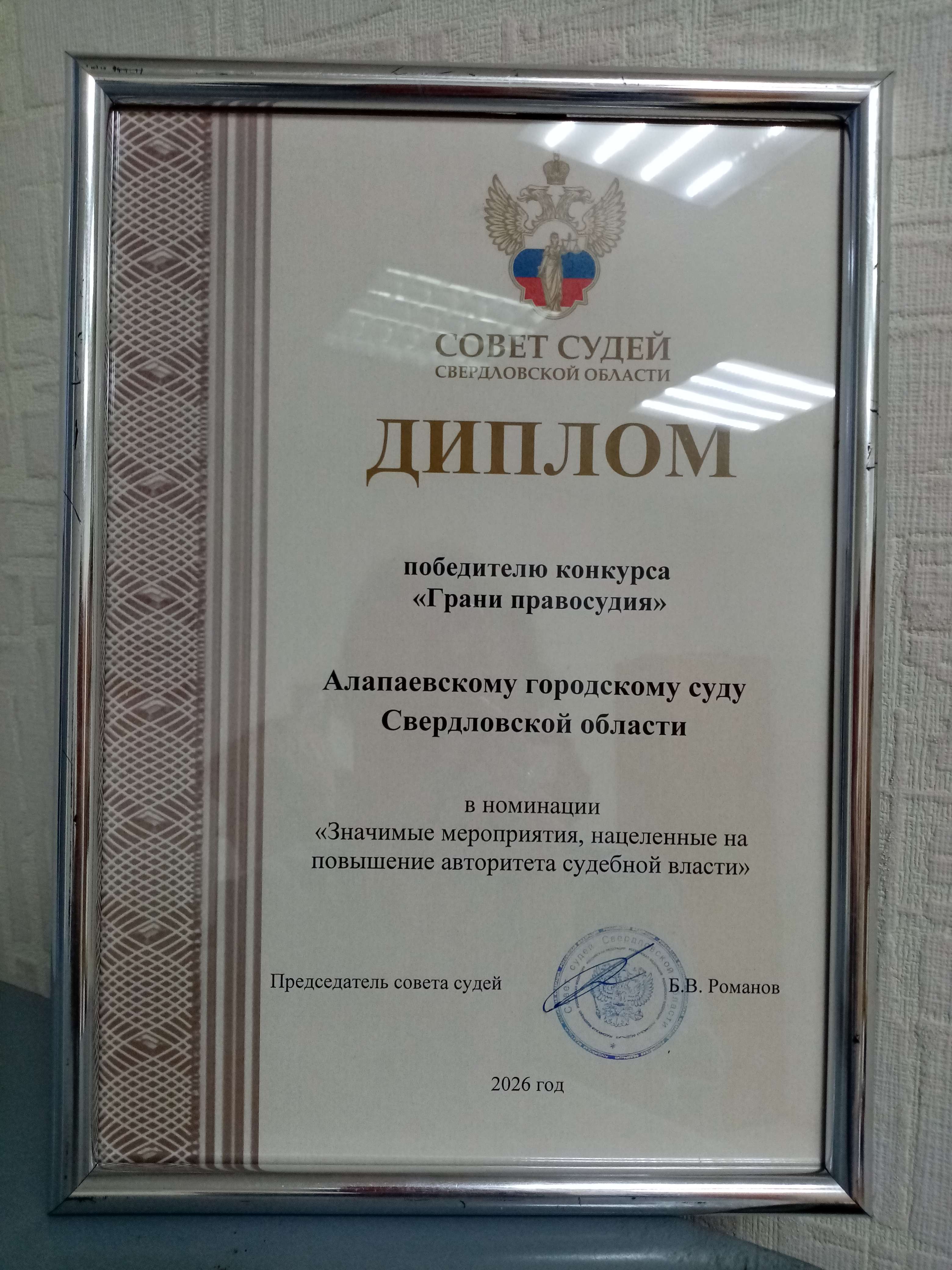 По итогам работы в 2025 году Алапаевский городской суд признан победителем ежегодного конкурса «Грани правосудия» в номинации «Значимые мероприятия, нацеленные на повышение авторитета судебной власти» ![]() |